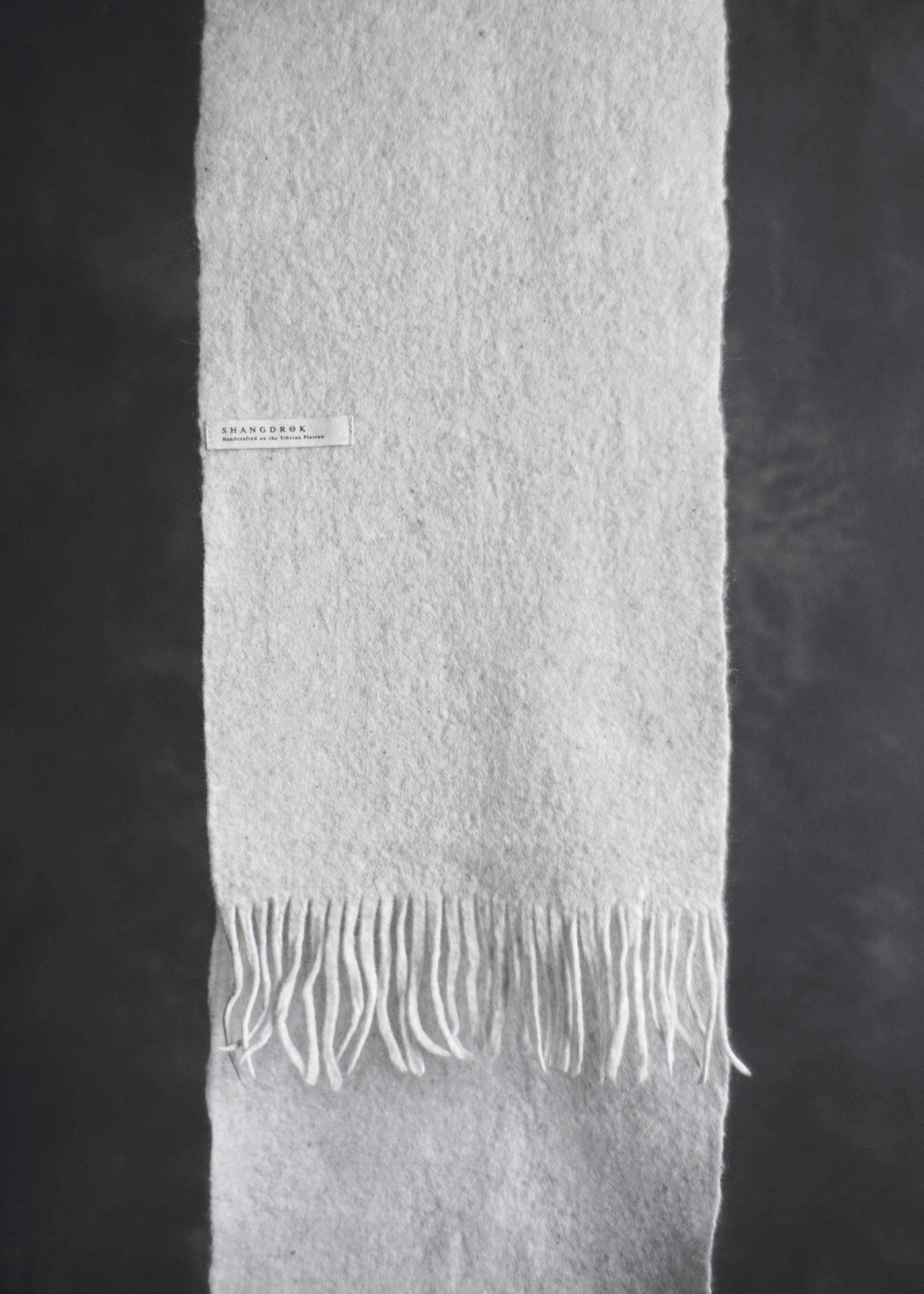 藏族的阿姨們製作這個圍巾時,總是一站就是七個小時,小心的將犛牛絨鋪的整齊均勻,手工搓揉而成,製作好的圍巾,散發著天然原色的光澤。完成晾乾後,她們站在陽光下,沈默著緊張的檢查著是否有不均或是破洞之處,如果發現沒有,會鬆了口氣的綻放著大大的微笑說:「好看得很!」