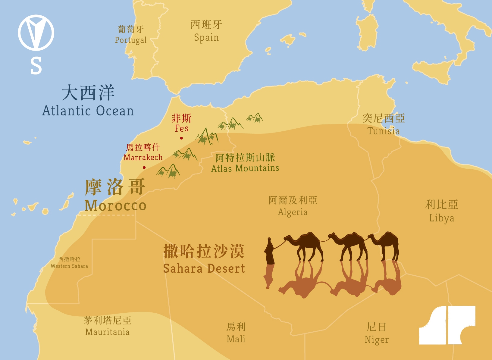 非洲北部被阿特拉斯山脈(Atlas Mountains)一分為二,如台灣中央山脈阻擋東邊來的颱風一樣,它也阻擋了來自南邊撒哈拉沙漠的炎熱空氣,使得山脈北邊能保有濕潤的潮溼氣候,這一帶地區被稱為「馬格里布」(Al-Maġrib),也是現今北非三國摩洛哥、阿爾及利亞、突尼西亞的所在地,緊鄰沙漠的摩洛哥甚至有「烈日下的清涼國土」之稱。
